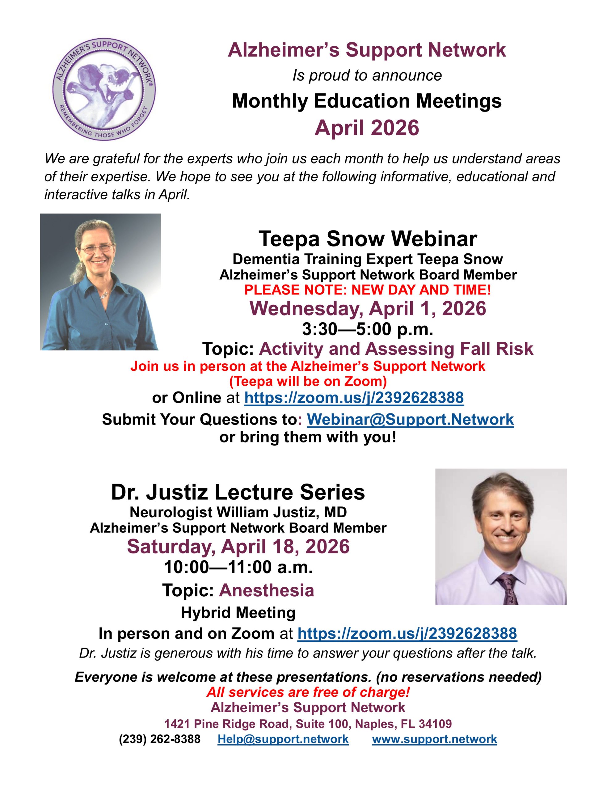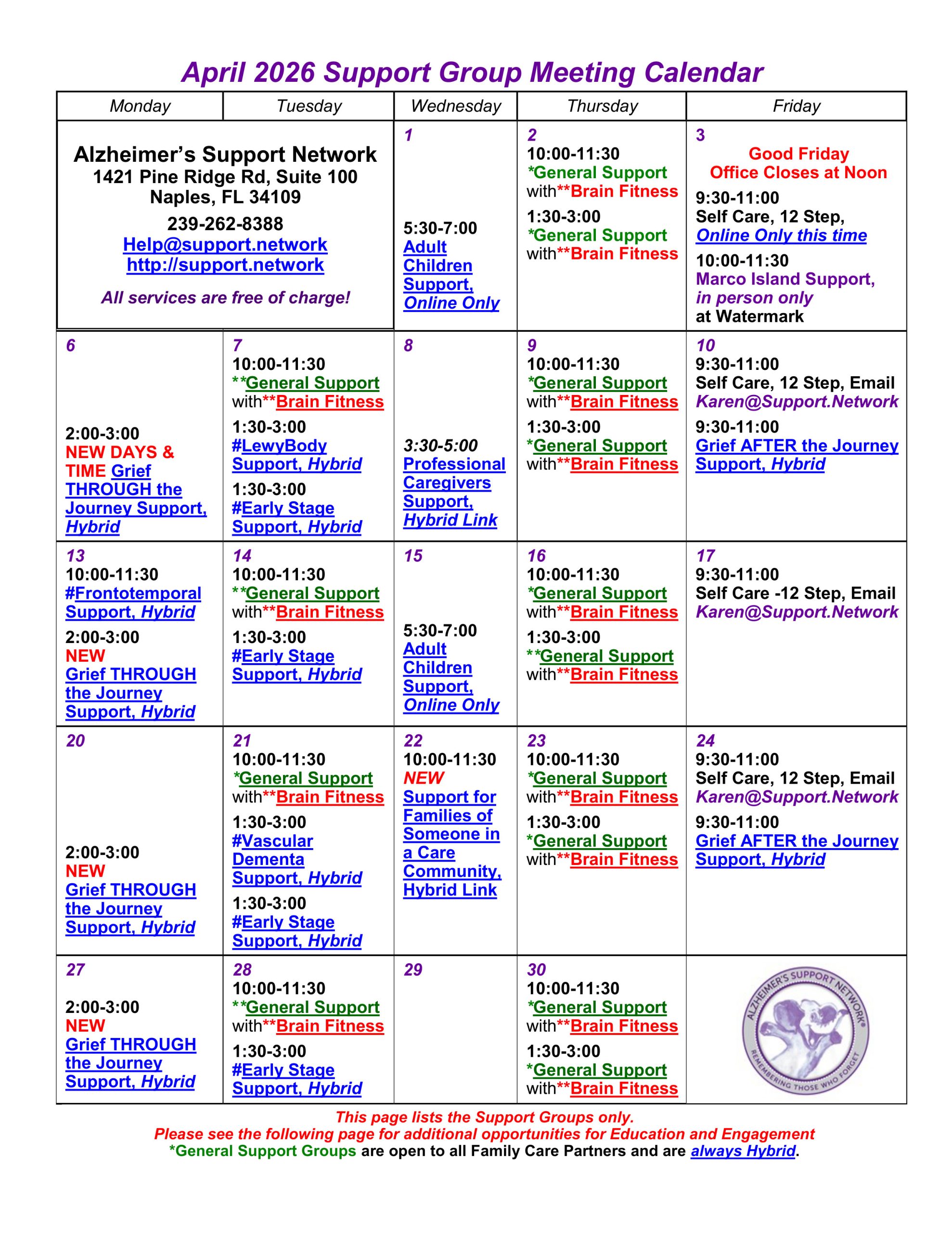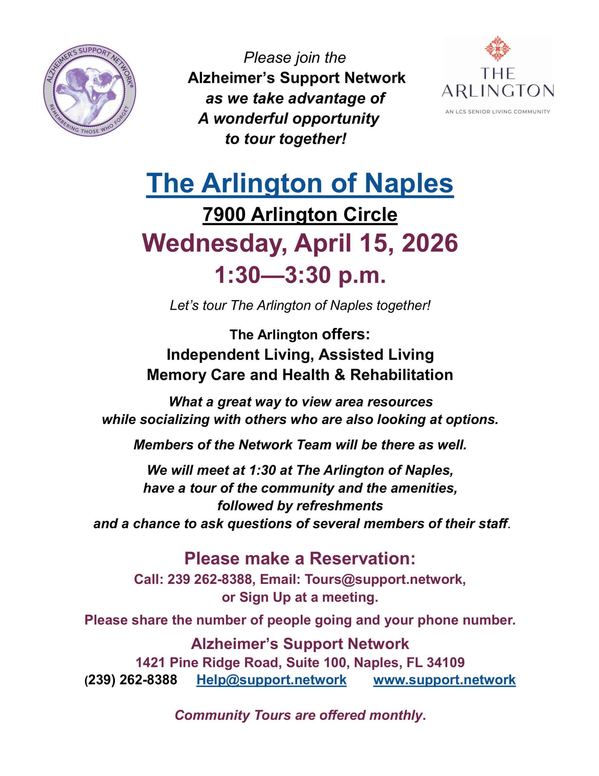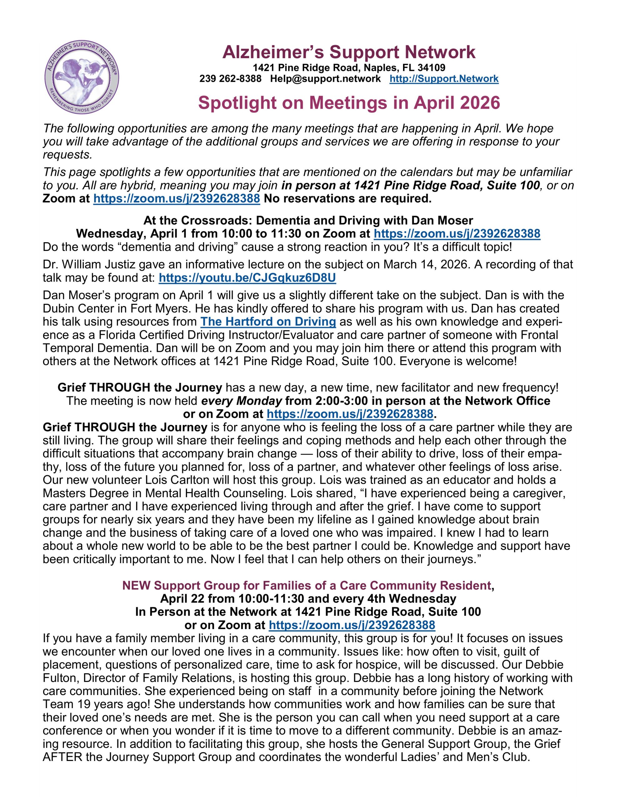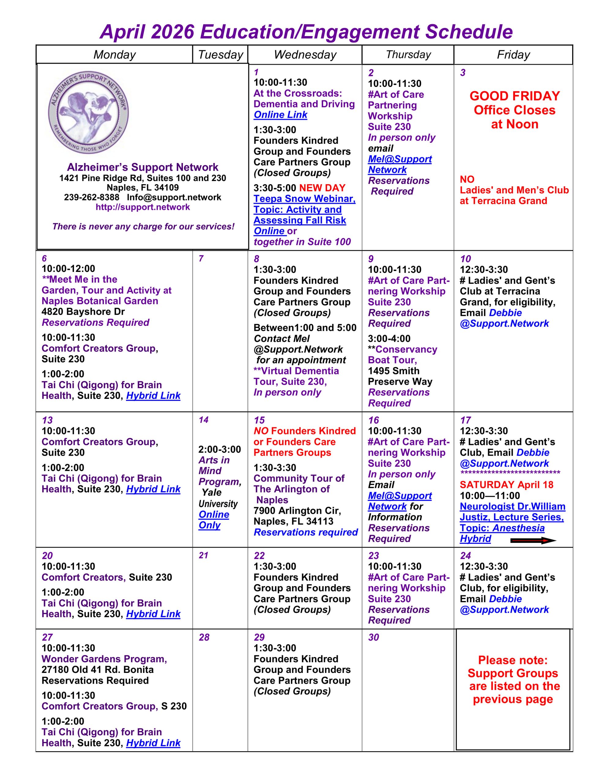 Monthly Flyers April Support Groups VIEW FLYER April Tour - Arlington VIEW FLYER Tai Chi for Brain Change and Care Partners VIEW FLYER April Spotlight VIEW FLYER April Speakers VIEW FLYER Comfort Creators VIEW FLYER April Educational & Engagement VIEW FLYER Art of Care Partnering VIEW FLYER Yale Arts in Mind VIEW FLYER